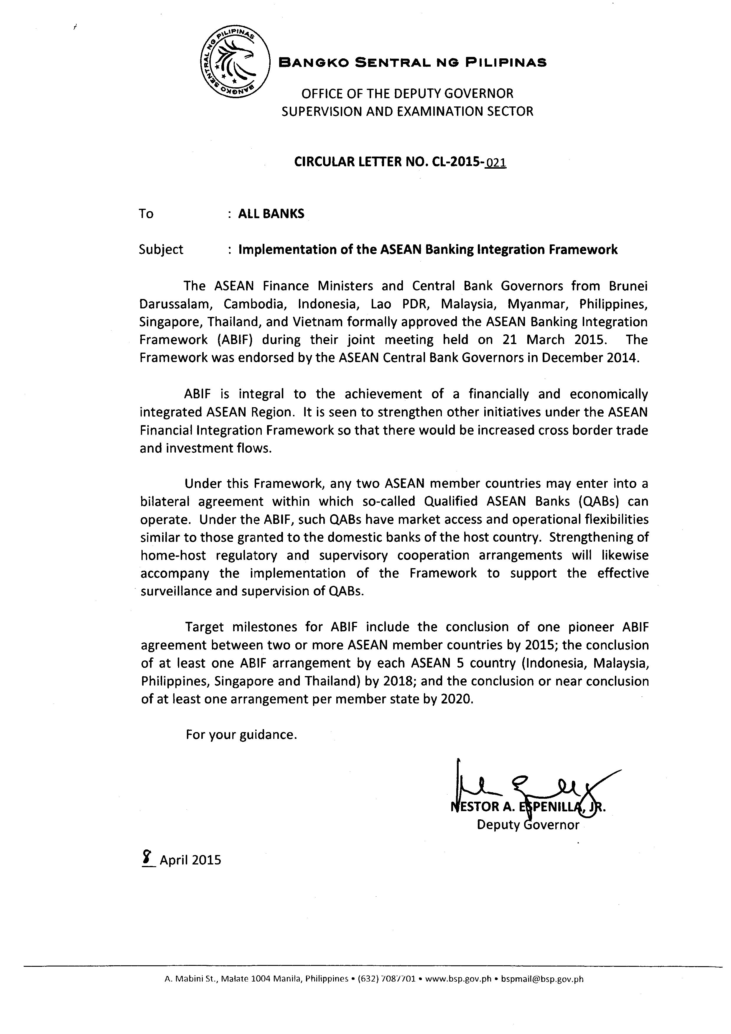 BSP Circular Letter No. CL-2015-021: Implementation of the ASEAN Banking Integration Framework
