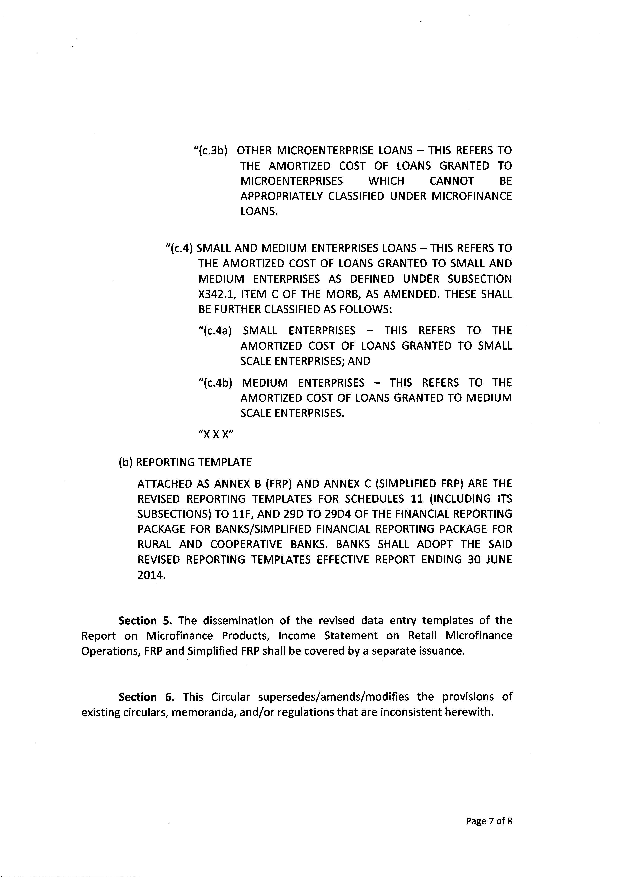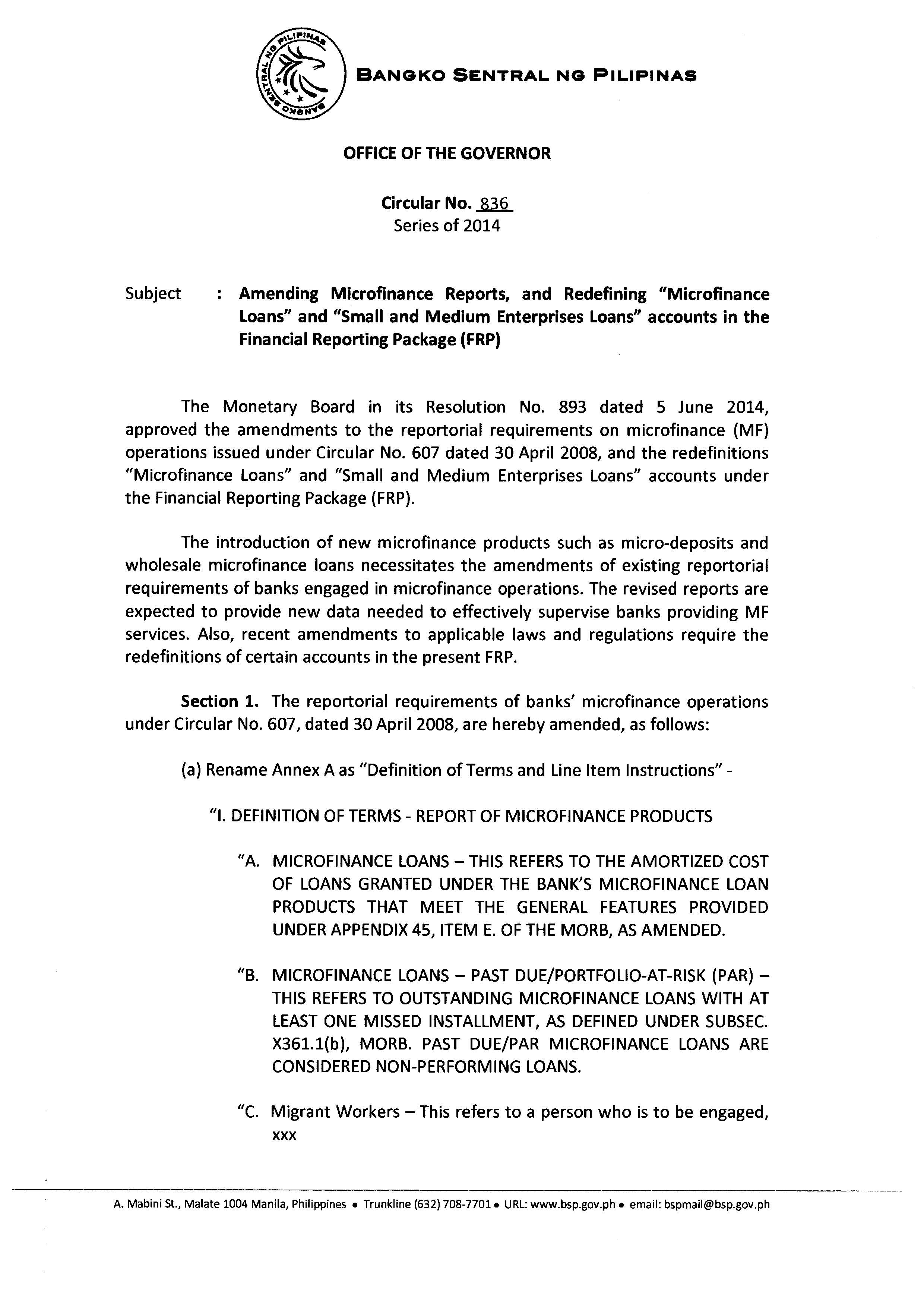 BSP Circular No. 836: Amending Mircofinance Reports, and Redefining “Microfinance Loans” and “Small and Medium Enterprises Loans” accounts in the Financial Reporting Package (FRP)