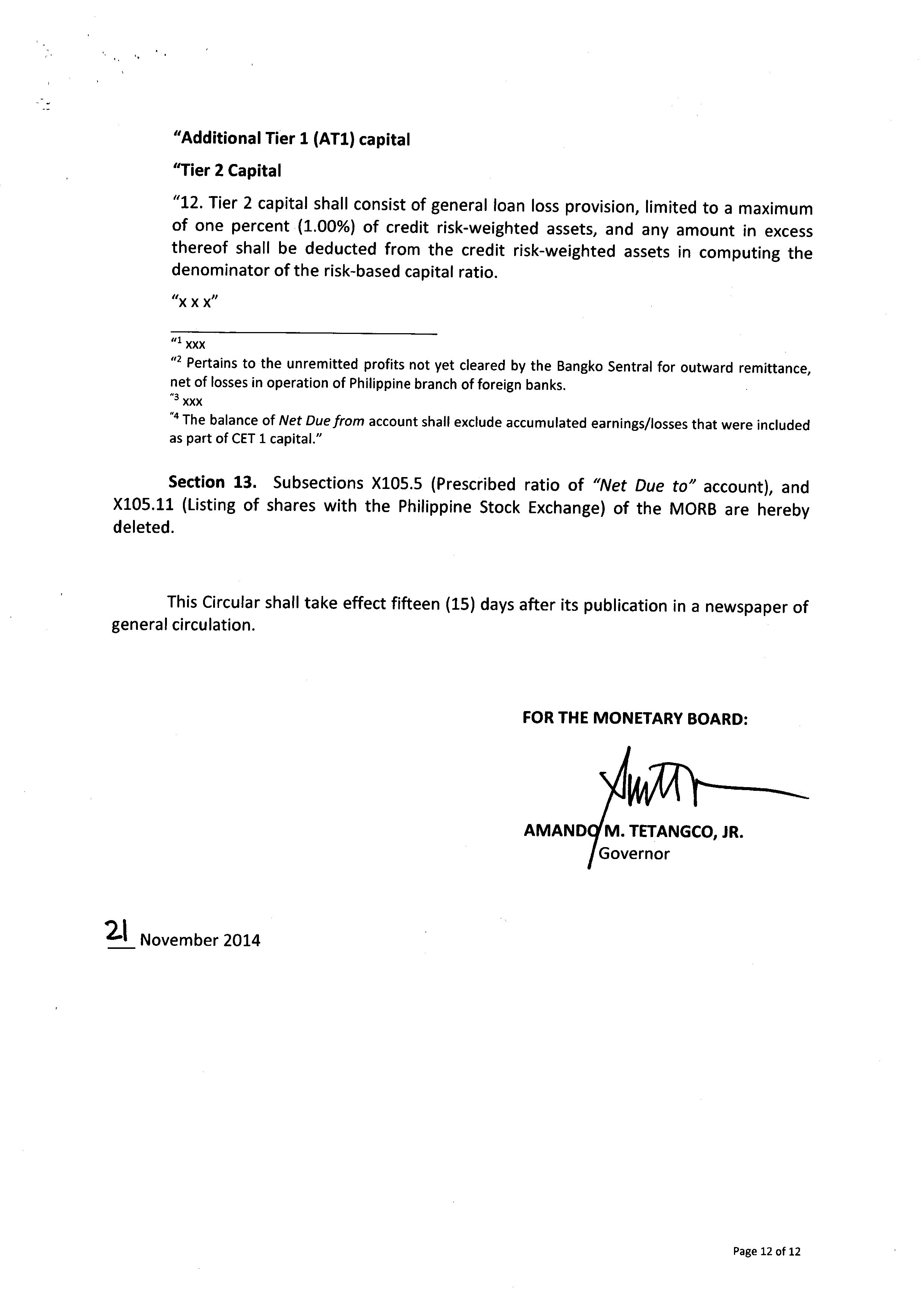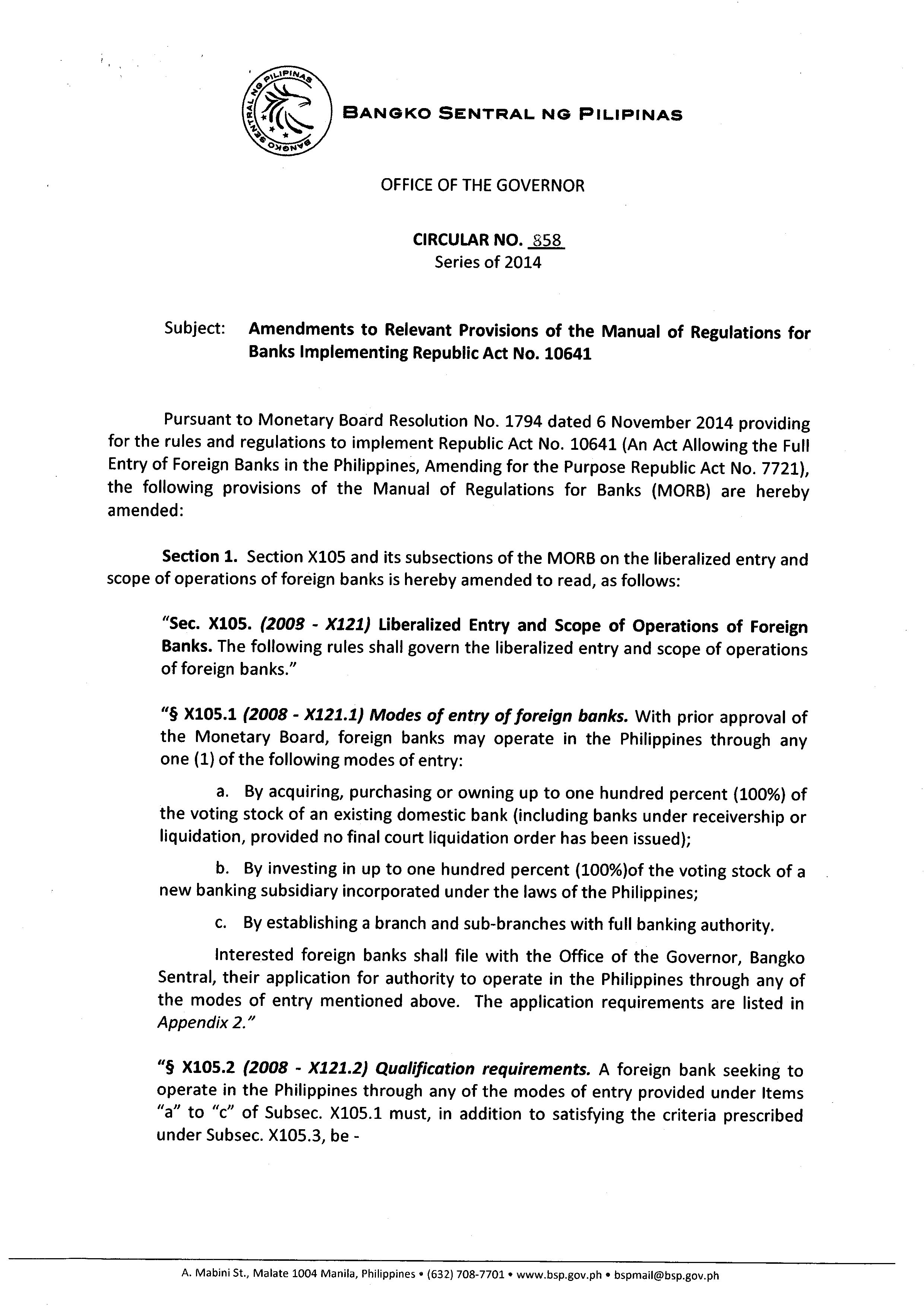 BSP Circular No. 858: Amendments to Relevant Provisions of the Manual of Regulations for Banks Implementing Republic Act No. 10641