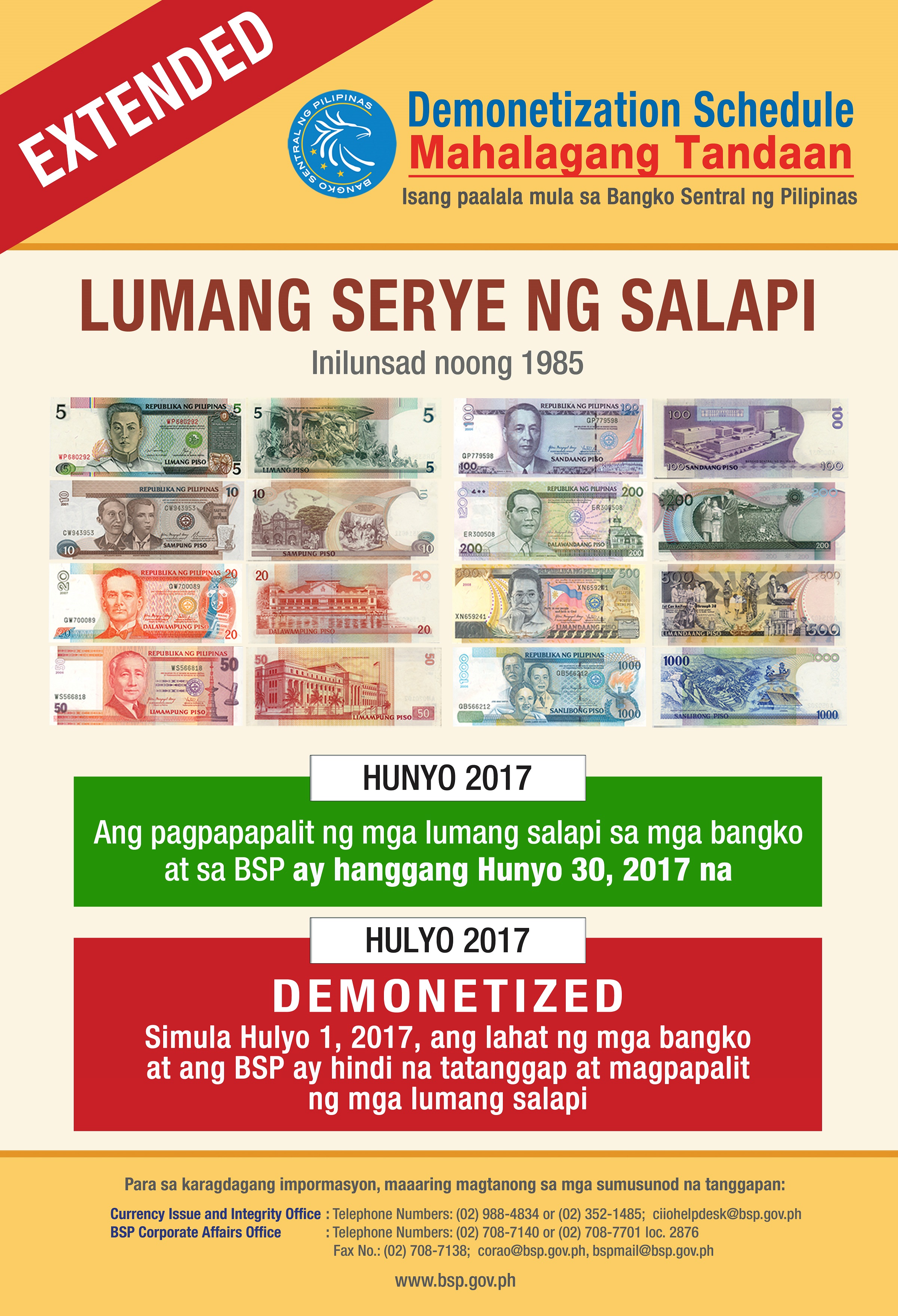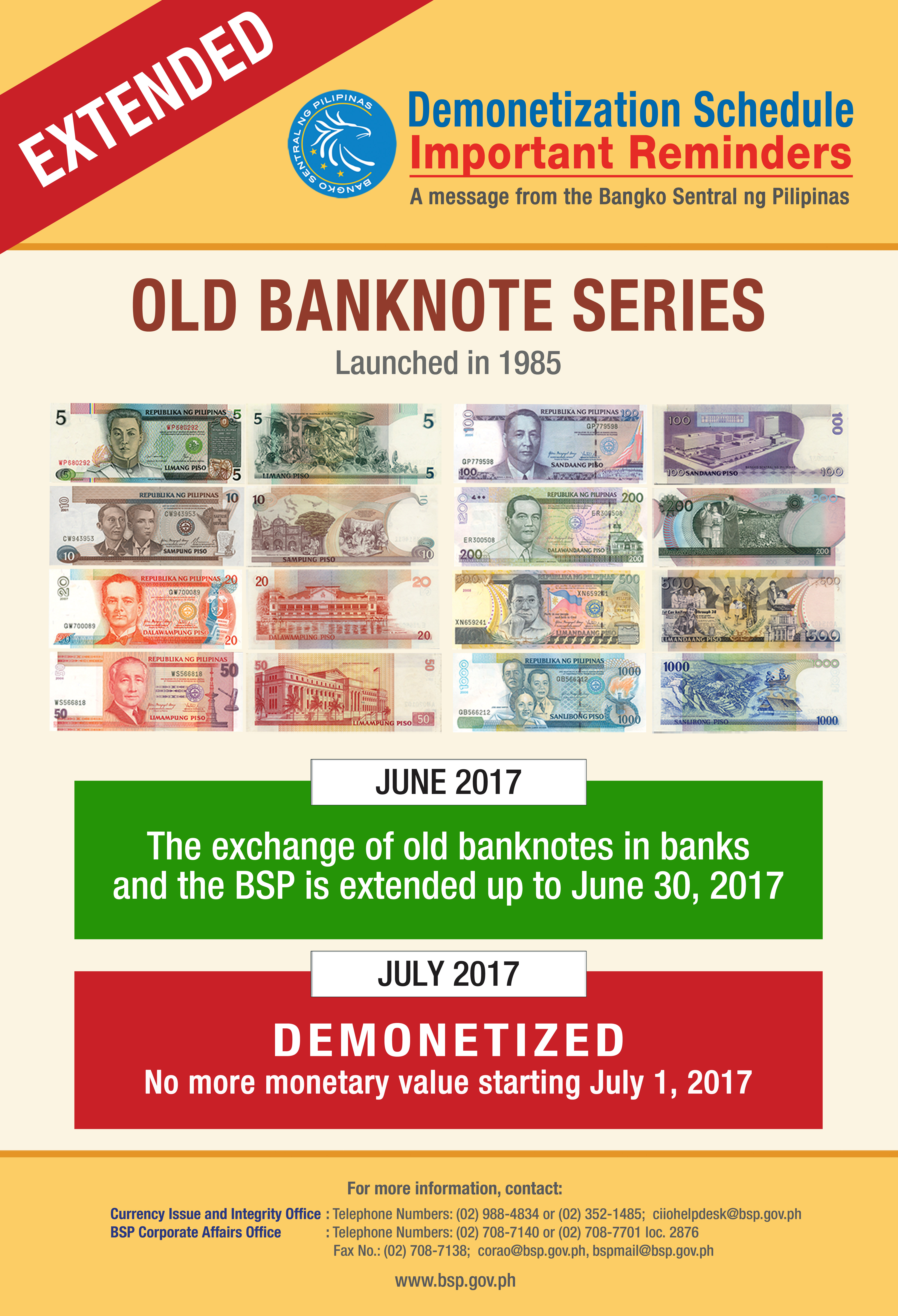 BSP extends deadline for the exchange/replacement of old note series (NDS) at par with the new note series (NGC) until 30 June 2017