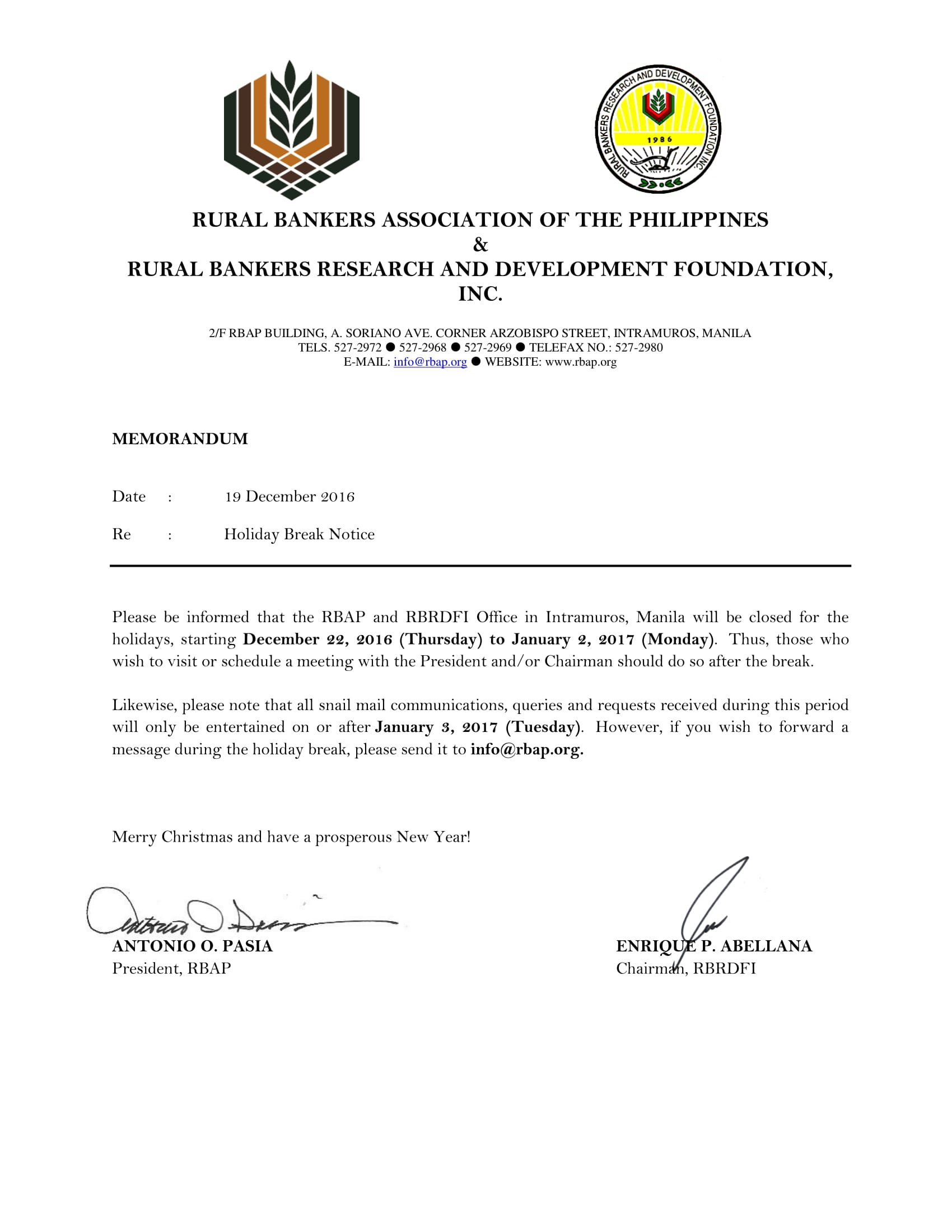 RBAP-RBRDFI Dec. ’16 Holiday Notice